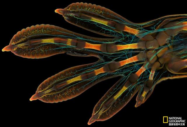 今天宣布的第一名的获奖图像是由日内瓦大学研究人员Grigorii Timin和Michel Milinkovitch合作拍摄的,照片展示了一只胚胎时期的马达加斯加大日行壁虎(Phelsuma grandis)的趾。使用显微镜和图像拼接,这张呈荧光透视的照片展示出壁虎趾微妙的复杂性,神经,肌腱,韧带,骨骼和血细胞被凸显出来,它们协同工作,帮助这些生物毫不费力地爬上墙壁。
