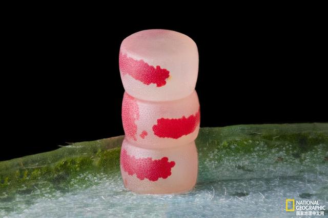 这个小塔是Ye Fei Zhang拍摄的一堆蛾卵。Zhang在电子邮件中写道“我在一片非常小的叶子上发现了这三个蛾卵,它们叠在一起,很奇怪。“我第一次发现蛾卵时,虫卵表面并没有红色斑点。在接下来的两天里,蛾卵的内部不断发育,出现了如此美丽的红色斑纹。”摄影:YE FEI ZHANG
