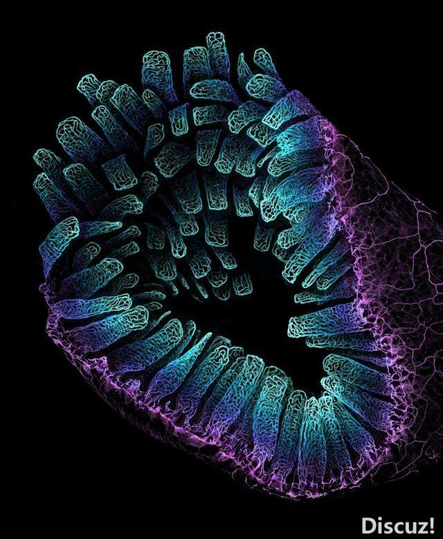 尽管这幅图很像Frank Herbert的小说《沙丘》中那种吃人的巨大沙虫,但这些漂亮的几何柱的边缘实际上是荧光染色后的小鼠肠道的横截面。这是赫尔辛基大学Satu Paavonsalo和Sinem Karaman合拍的作品,在今年的比赛中获得了第三名。摄影:SATU PAAVONSALO AND SINEM KARAMAN